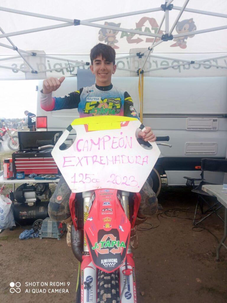 El piloto de Miajadas, Samuel Tapia se ha proclamado campeón de Extremadura de Motocross, categoría de 125 cc tras la finalización del campeonato extremeño, cuya última carrera ha tenido lugar este domingo en el circuito de Pueblonuevo de Miramontes. El miajadeño consiguió imponerse en su categoría, ocupando también la tercera posición de la general, en una carrera muy inteligente, en la que supo administrar los puntos del campeonato y hacer una última gran manga, una vez asegurado el título regional.
